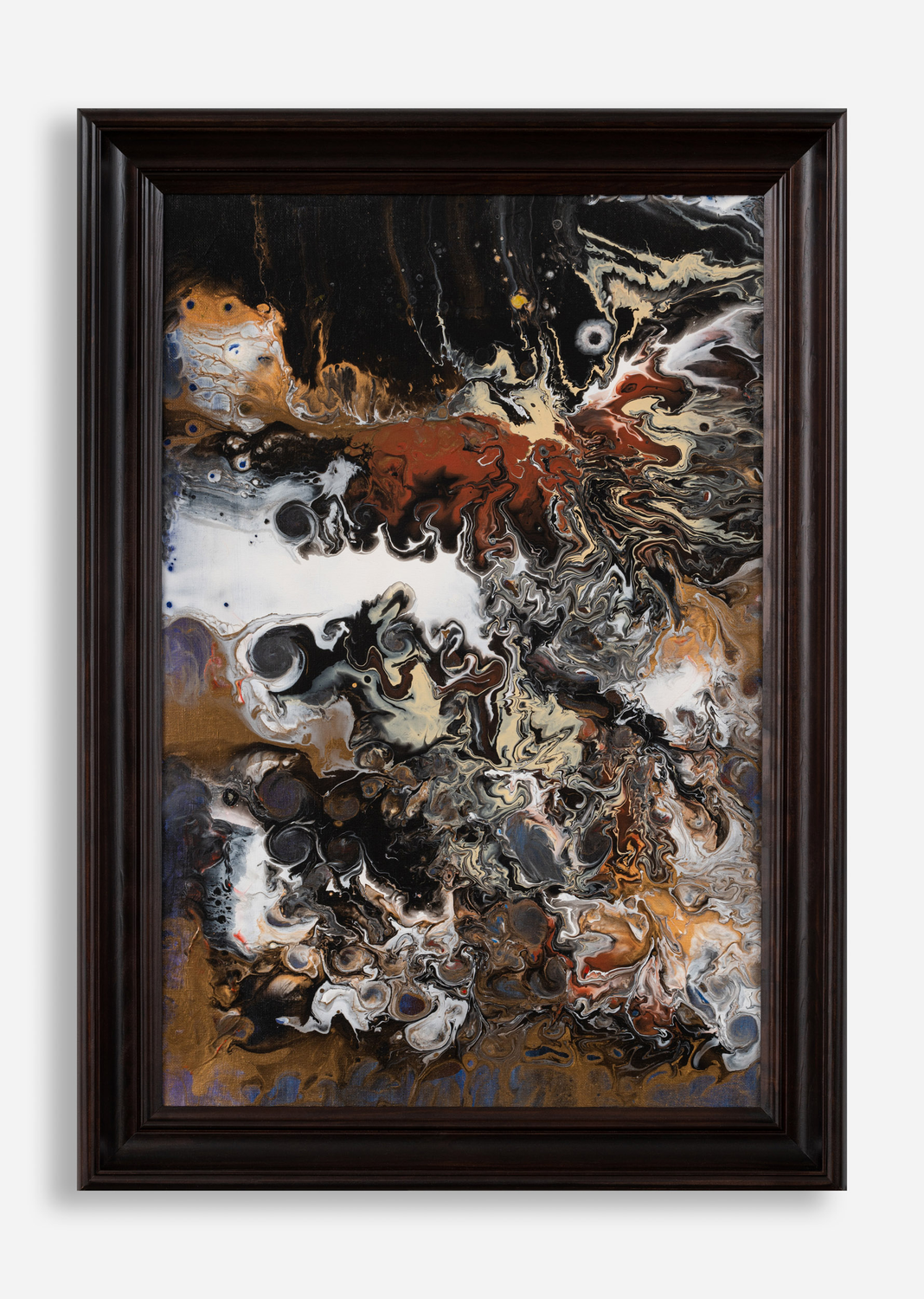 Ten obraz to prawdziwy labirynt barw i kształtów, który wciąga widza w głąb swojej złożoności. Czarne, niczym kosmiczna otchłań, tło staje się płótnem dla eksplozji bieli, złota, miedzi, brązów i szarości. Barwy te przeplatają się, tworząc wirujące, organiczne formy, które zdają się pulsować i zmieniać wraz z każdym spojrzeniem. To dzieło, któremu można się przyglądać godzinami, odkrywając w nim coraz to nowe detale i interpretacje. Każde spojrzenie to podróż w głąb abstrakcyjnego świata, gdzie wyobraźnia nie zna granic.