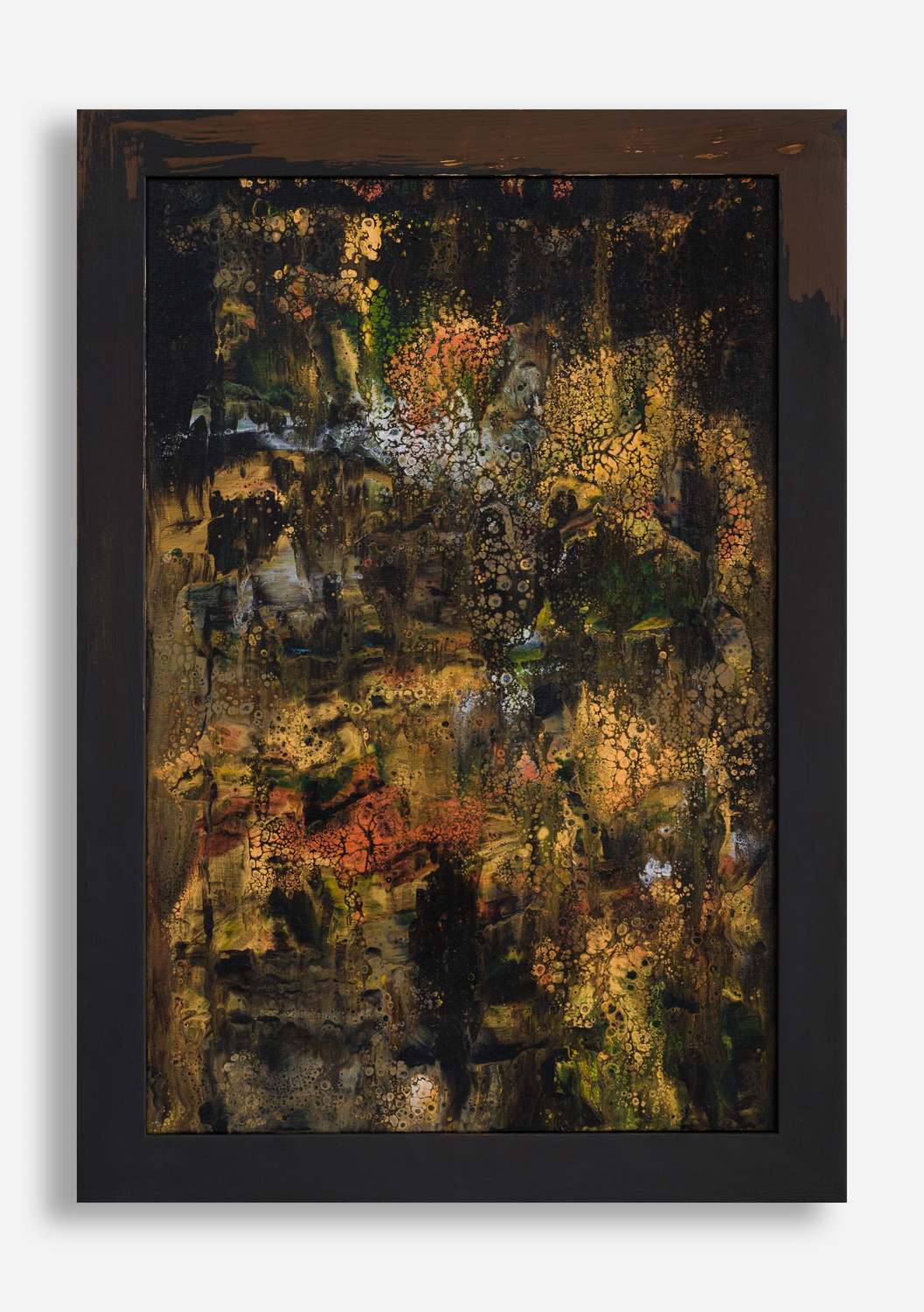 Obraz "Degradacja" charakteryzuje się mroczną i tajemniczą paletą barw, zdominowaną przez złoto, czernie, brązy, rdzawe pomarańcze, przygaszone żółcie czy zielenie. Kolory te, kojarzące się z rozkładem, spalenizną i upływem czasu, potęgują wrażenie degradacji i zniszczenia.