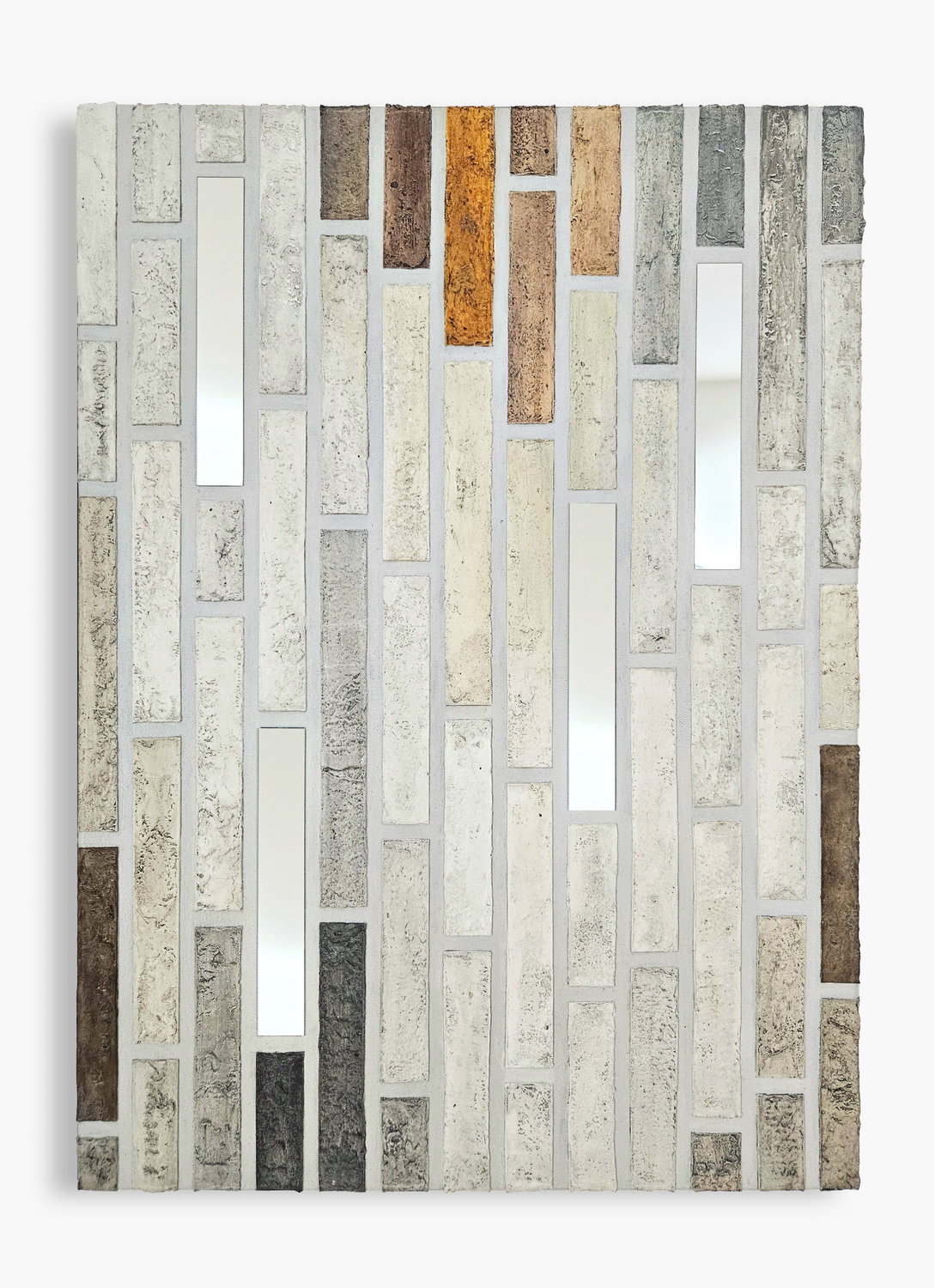 Obraz strukturalny „Moduł” to wielowarstwowa kompozycja o geometrycznej precyzji, inspirowana rytmem miejskich fasad i organiczną teksturą natury. Dominują w nim odcienie złamanej bieli, subtelnych szarości i głębokich brązów, uzupełnione akcentami ciepłego drewna oraz lustrzanych elementów. Te ostatnie, choć nie są wykonane ze szkła, tworzą subtelne refleksy światła, dodając kompozycji dynamiki i wrażenia przestrzeni.