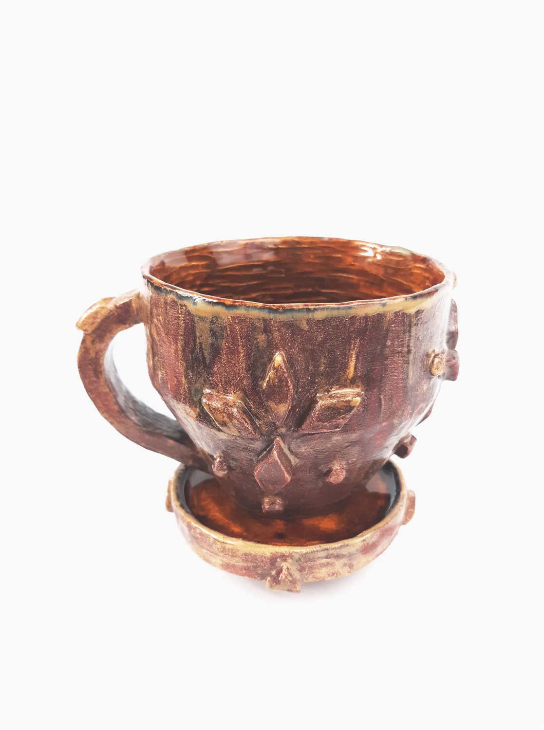 Kubek wraz z podstawką wykonany z jasnej masy ceramicznej. Całość niejednolicie pokryta szkliwami w odcieniach brązu. Efekt mokrego dna. Szkliwo pięknie pracuje ze światłem, zobaczysz to lepiej na https://www.instagram.com/p/CgUgGDXllwg/.