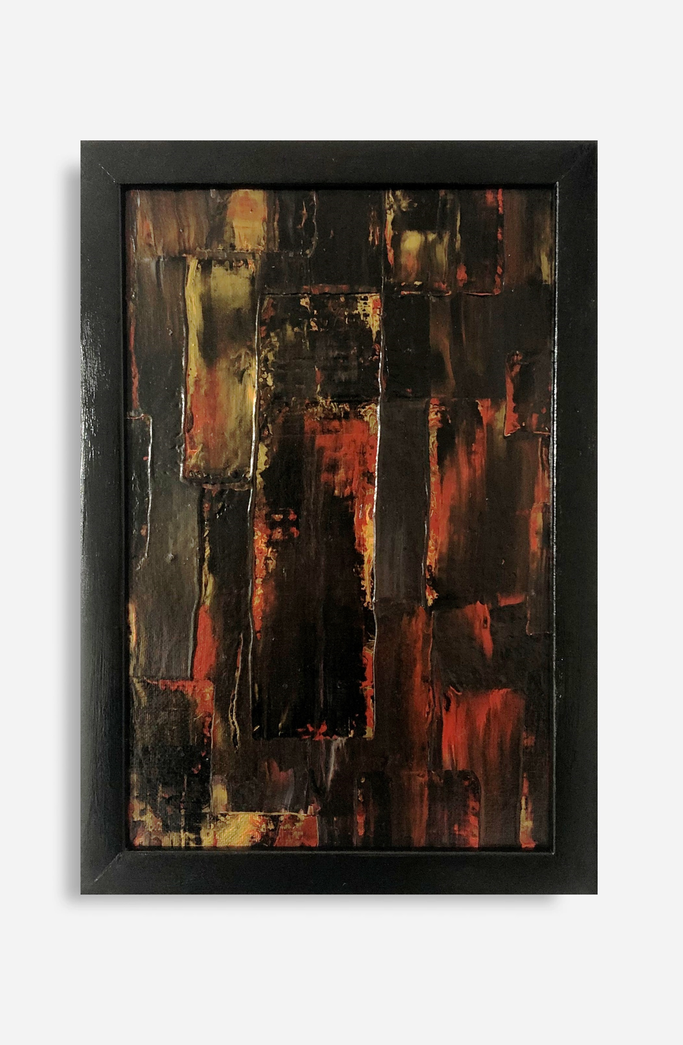 Obraz na bawełnianym płótnie, naciągniętym na krosno malarskie. Oprawiony w wąską, czarną, drewnianą ramę o błyszczącym wykończeniu. Ręcznie wykonany techniką mieszaną/własną. Powstał na bazie farb akrylowych w odcieniach złota, czerwieni, czerni oraz brązu. Połączonych z mediami malarskimi. Nowoczesna forma pasująca do wnętrz o wielu stylach. Zabezpieczony werniksem. Na rewersie podpis autorki.