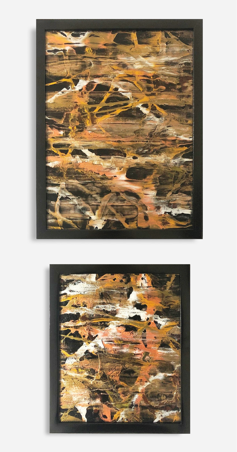 Cykl dwóch obrazów na bawełnianych płótnach, naciągniętych na krosna malarskie. Oprawione w czarne, drewniane ramy o błyszczącym wykończeniu. Ręcznie wykonane techniką mieszaną/własną. Powstały na bazie metalicznych farb akrylowych, połączonych z mediami malarskimi. Nowoczesna forma pasująca do wnętrz o wielu stylach. Zabezpieczone werniksem. Na rewersie podpis autorki.