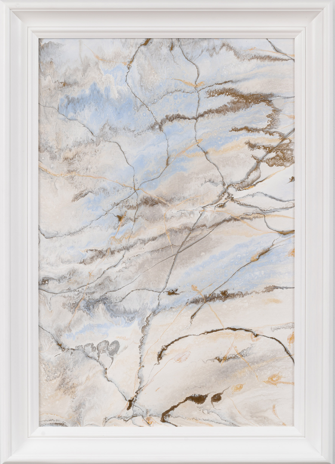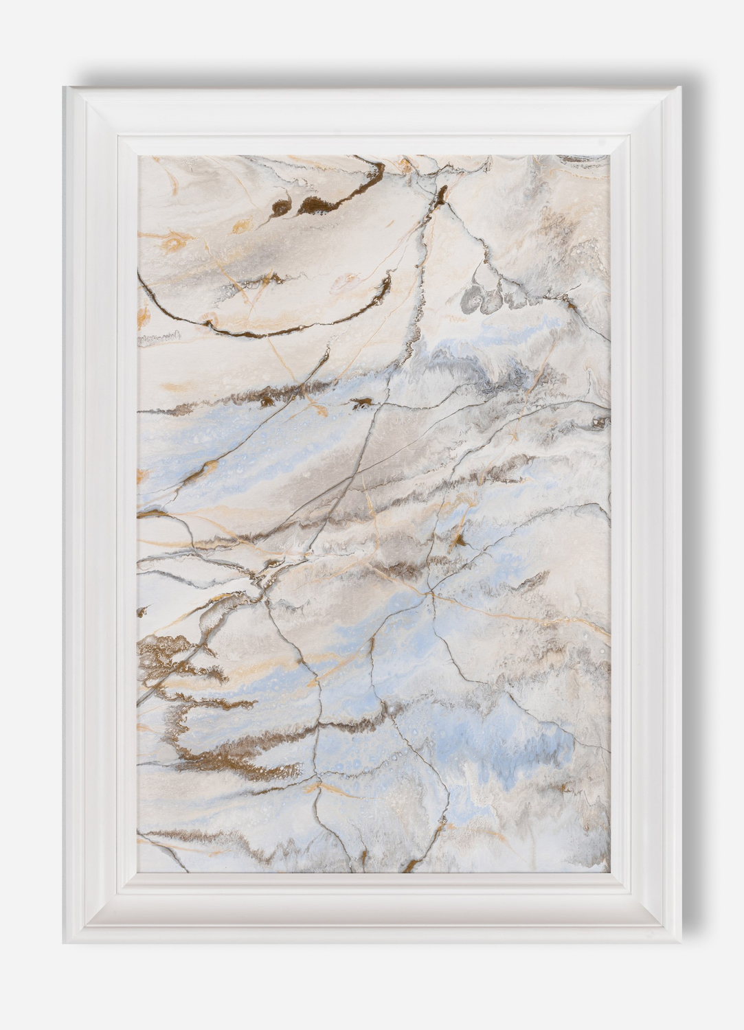 Abstrakcja na bawełnianym płótnie, naciągniętym na krosno malarskie. Obraz oprawiony w białą ramę z naturalnego drewna, o szerokości 50 mm. Ręcznie wykonany techniką mieszaną/własną, na bazie wysokiej jakości farb akrylowych. Nowoczesny a za razem pasujący do klasycznego wystroju. Charakter uspokajający bądź pobudzający zależnie od orientacji (drugie zdjęcie). Iluzja wielowymiarowości płaszczyzn bez faktury. Zabezpieczony werniksem. Na tyle płótna nosi podpis autora.