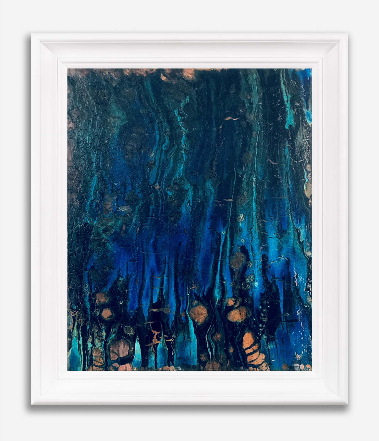 Obraz przedstawia abstrakcyjną kompozycję w odcieniach granatu, błękitu i miedzi, oprawioną w białą ramę. Dominującą techniką jest pouring, co widoczne jest w płynnych przejściach między kolorami i organicznych kształtach przypominających spływającą ciecz.