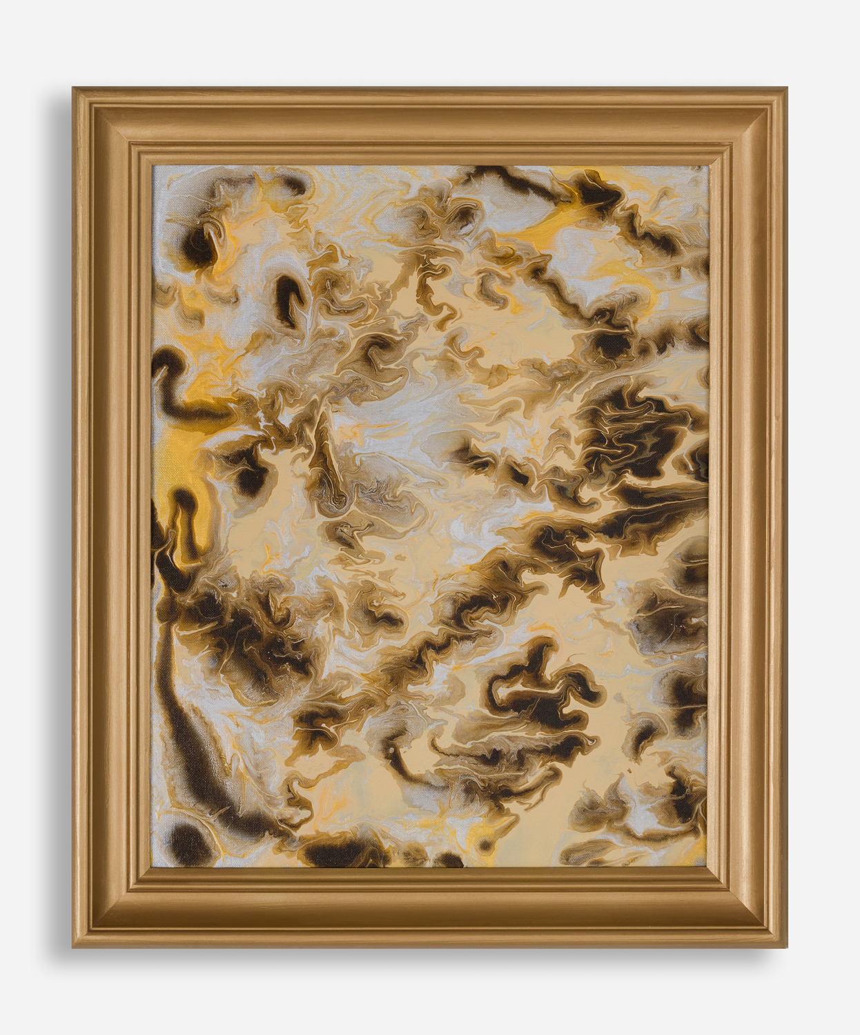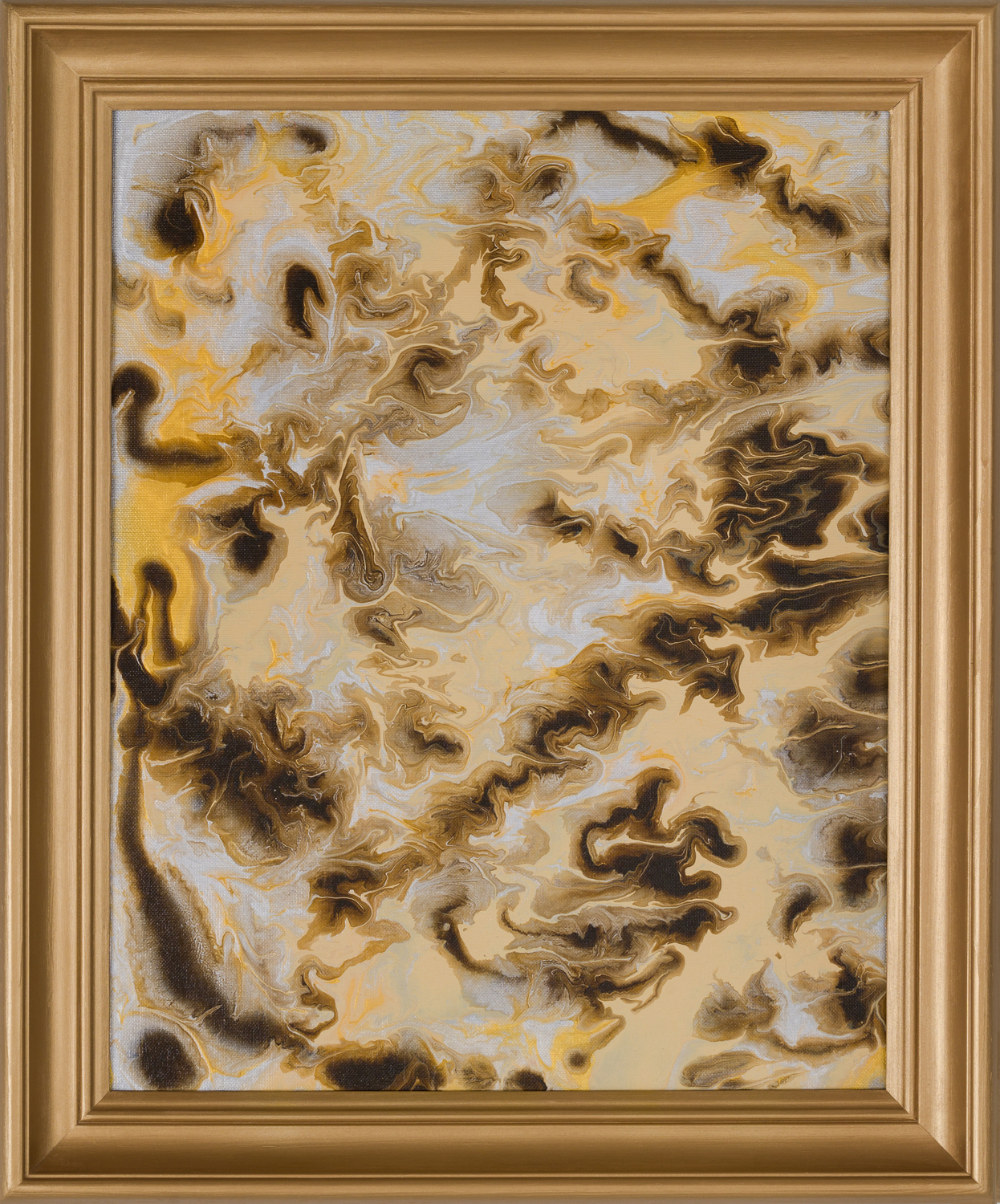 "Przesyt" - tytuł, który sam w sobie niesie ciężar nadmiaru, znajduje odzwierciedlenie w chaosie barw i kształtów. Złota rama, niczym próżna próba okiełznania żywiołu, więzi w swym wnętrzu bezkresny wir bieli, czerni i złota. To taniec przeciwieństw, gdzie światło przeplata się z cieniem, a spokój walczy z niepokojem. Płynne linie, niczym strumienie lawy, wiją się i splatają, tworząc labirynt bez wyjścia. To metafora ludzkiej duszy, przytłoczonej nadmiarem bodźców, uwięzionej w złotej klatce własnych pragnień. "Przesyt" to nie tylko obraz, to lustro, w którym przegląda się współczesny człowiek - zagubiony w gąszczu możliwości, spragniony ciszy i prostoty.