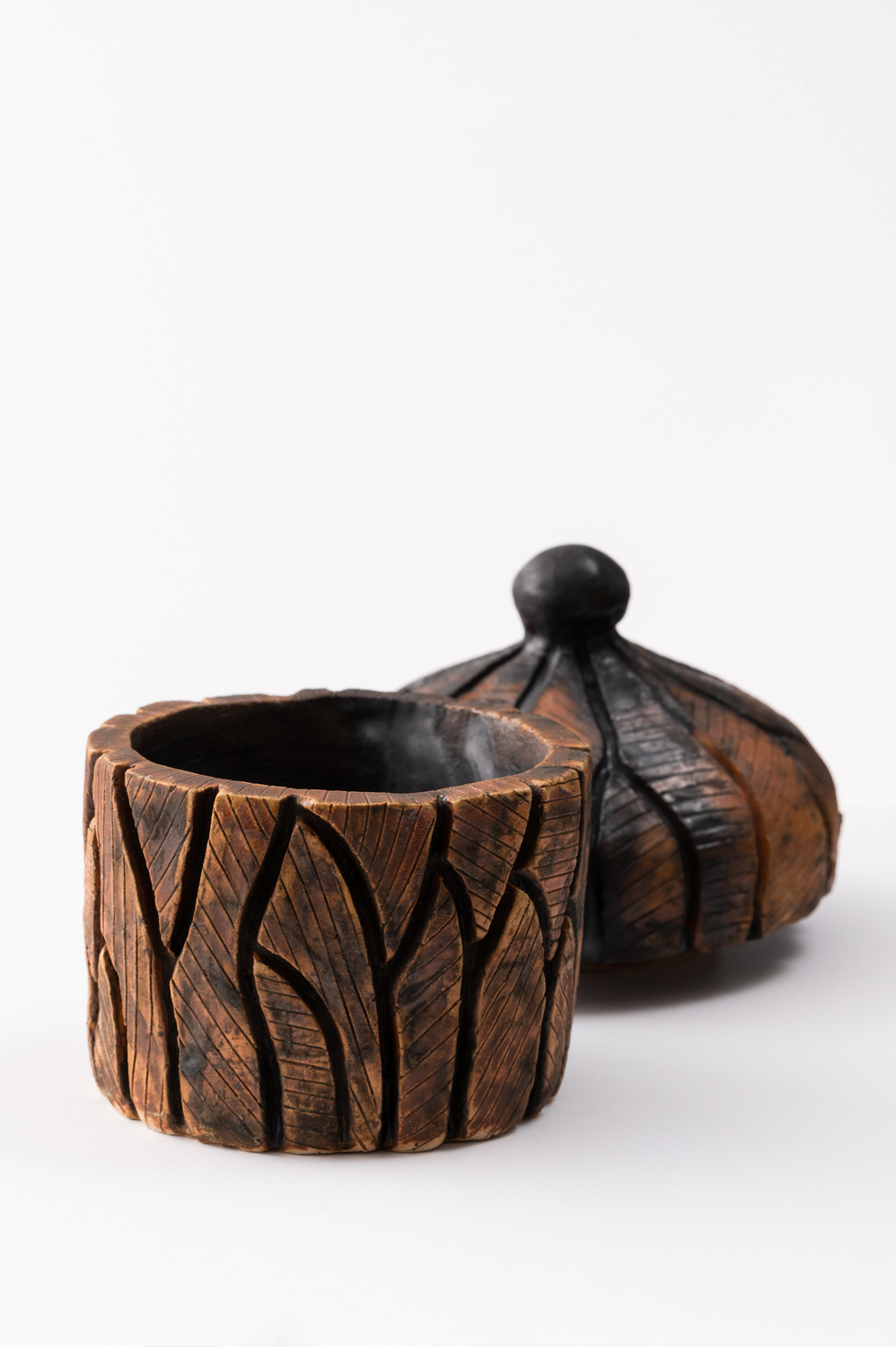 Wykonane z jasnej masy ceramicznej, pokryte szkliwami w odcieniach brązu z metalicznym wykończeniem. Pojemnik jest ciężki, o grubych ściankach i fakturze. Nie nadaje się do przechowywania żywności ze względu na skład szkliwa.