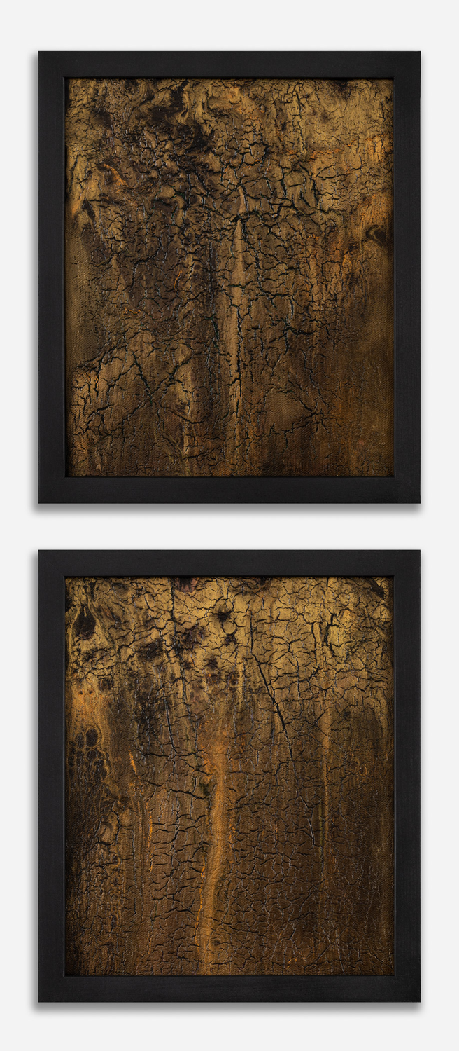 Dwa płótna ukazują spękaną, złocistą powierzchnię. To nie złoto bogactwa, lecz złoto wypalone w ogniu doświadczeń, naznaczone siatką życiowych dróg i przeszkód. Każda szczelina, każdy odprysk farby opowiada historię walki, bólu, ale i nieustającej woli przetrwania.