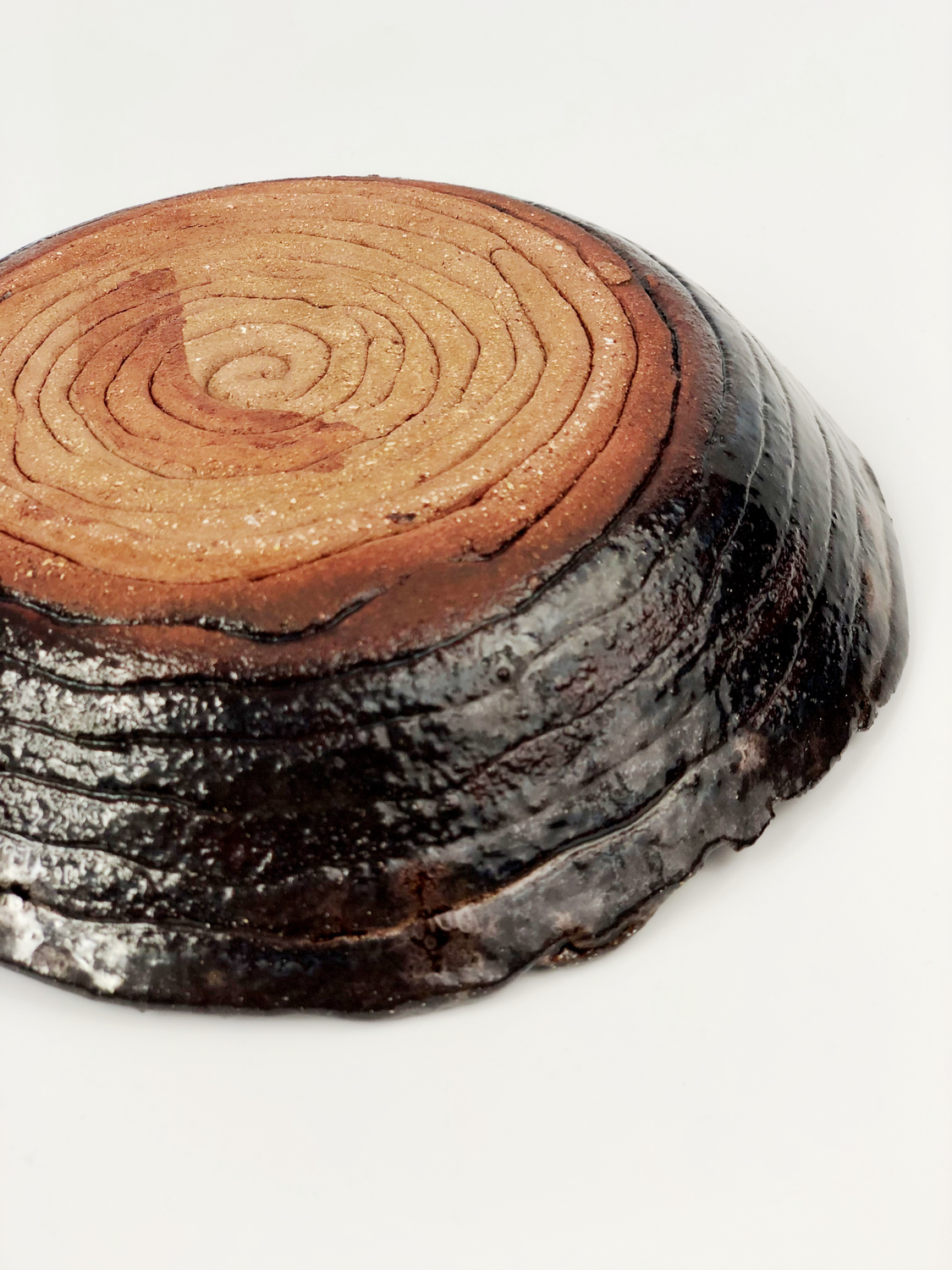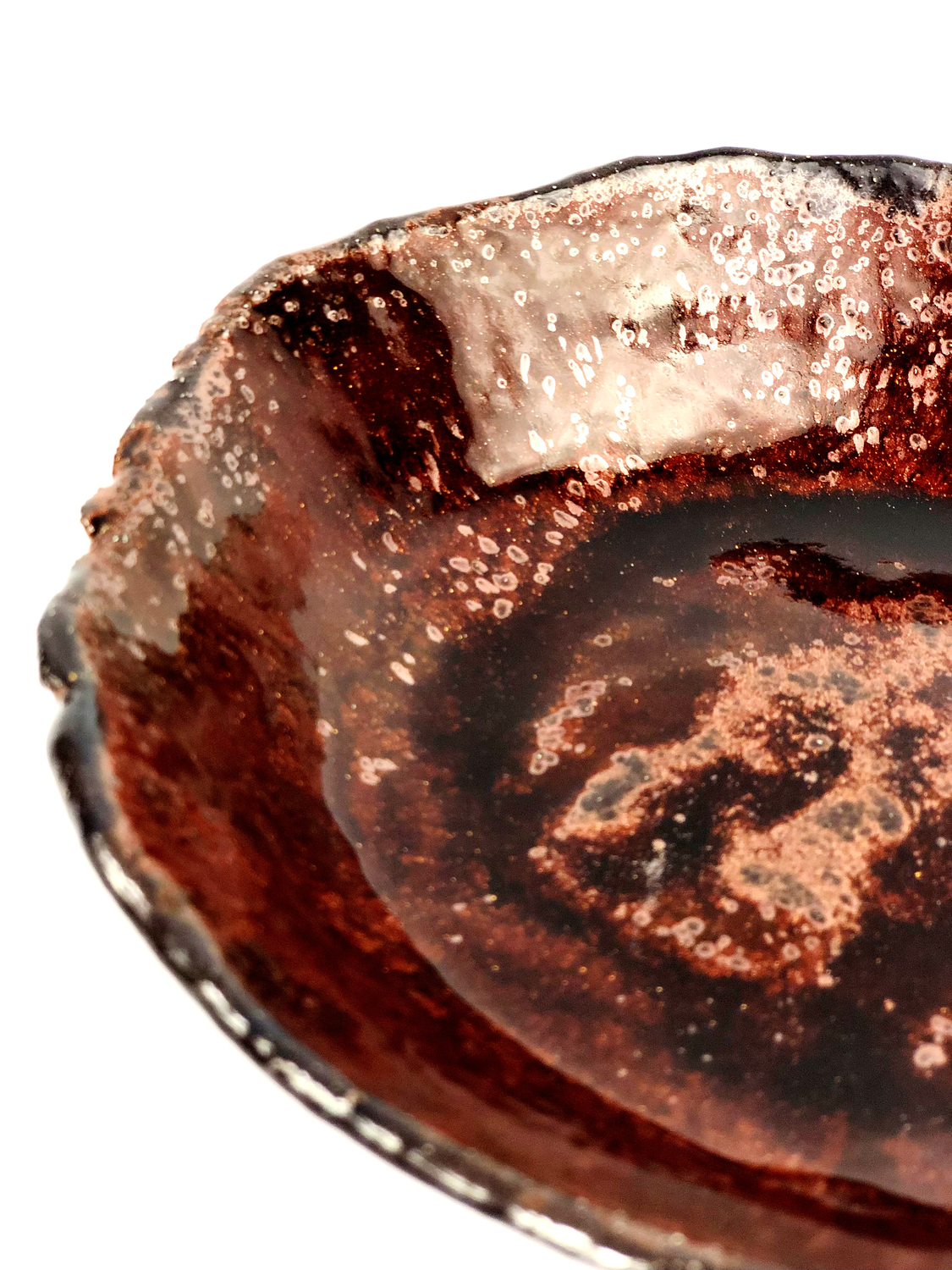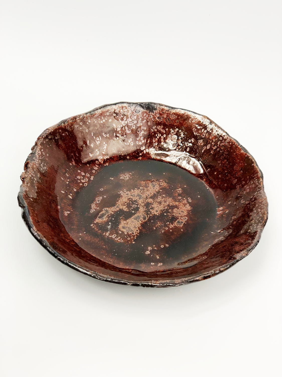 Talerz wykonany "prymitywną" metodą wylepiania z czerwonej masy ceramicznej. Szkliwiony dwukrotnie i wypalony trzykrotnie dla uzyskania kilku warst widocznych w transparentnym szkliwie. Talerz mieni się w świetle dzięki drobinkom przypominającym brokat zanurzony w szkle. Można również zauważyć małe metaliczne obwódki.