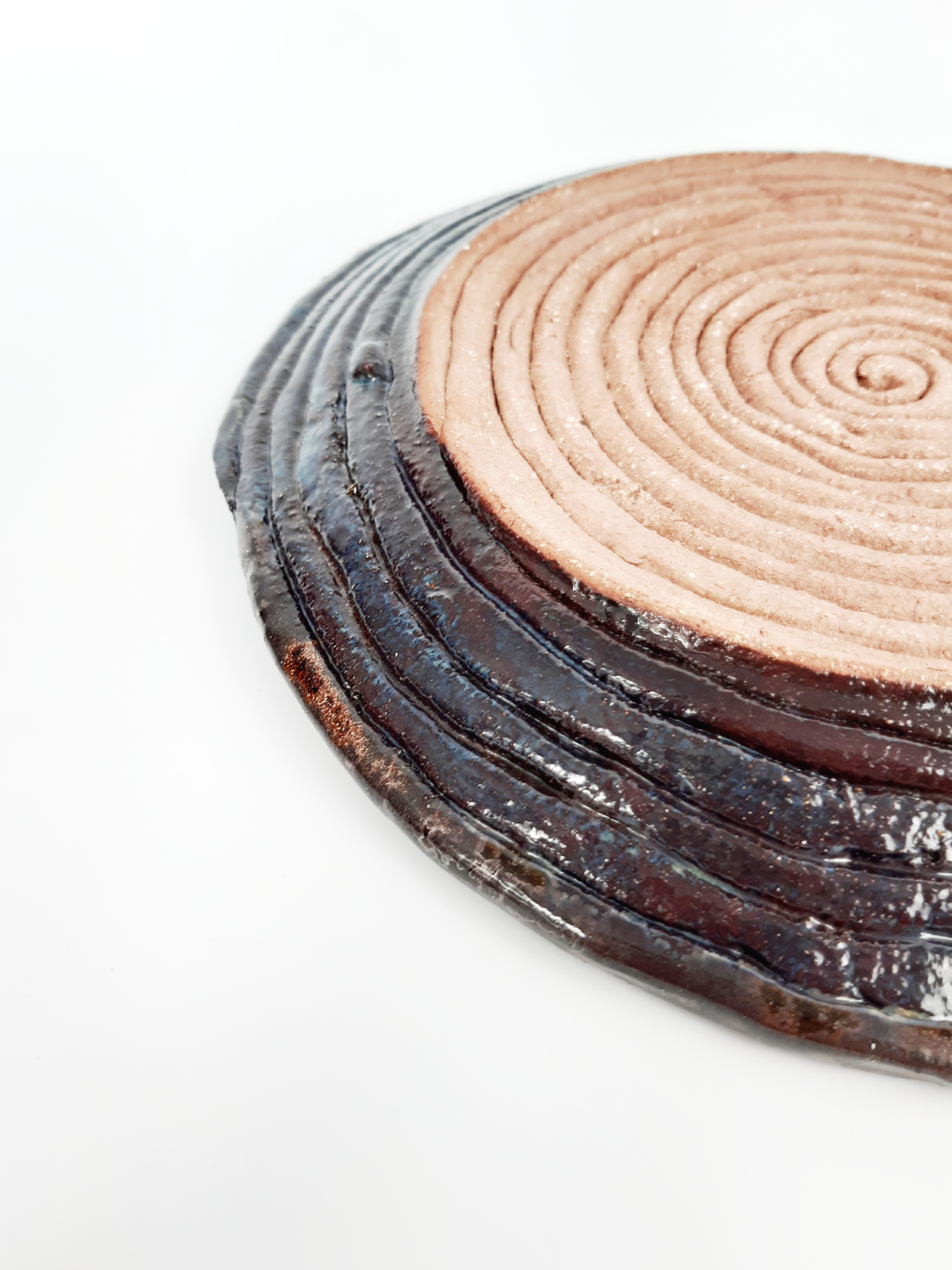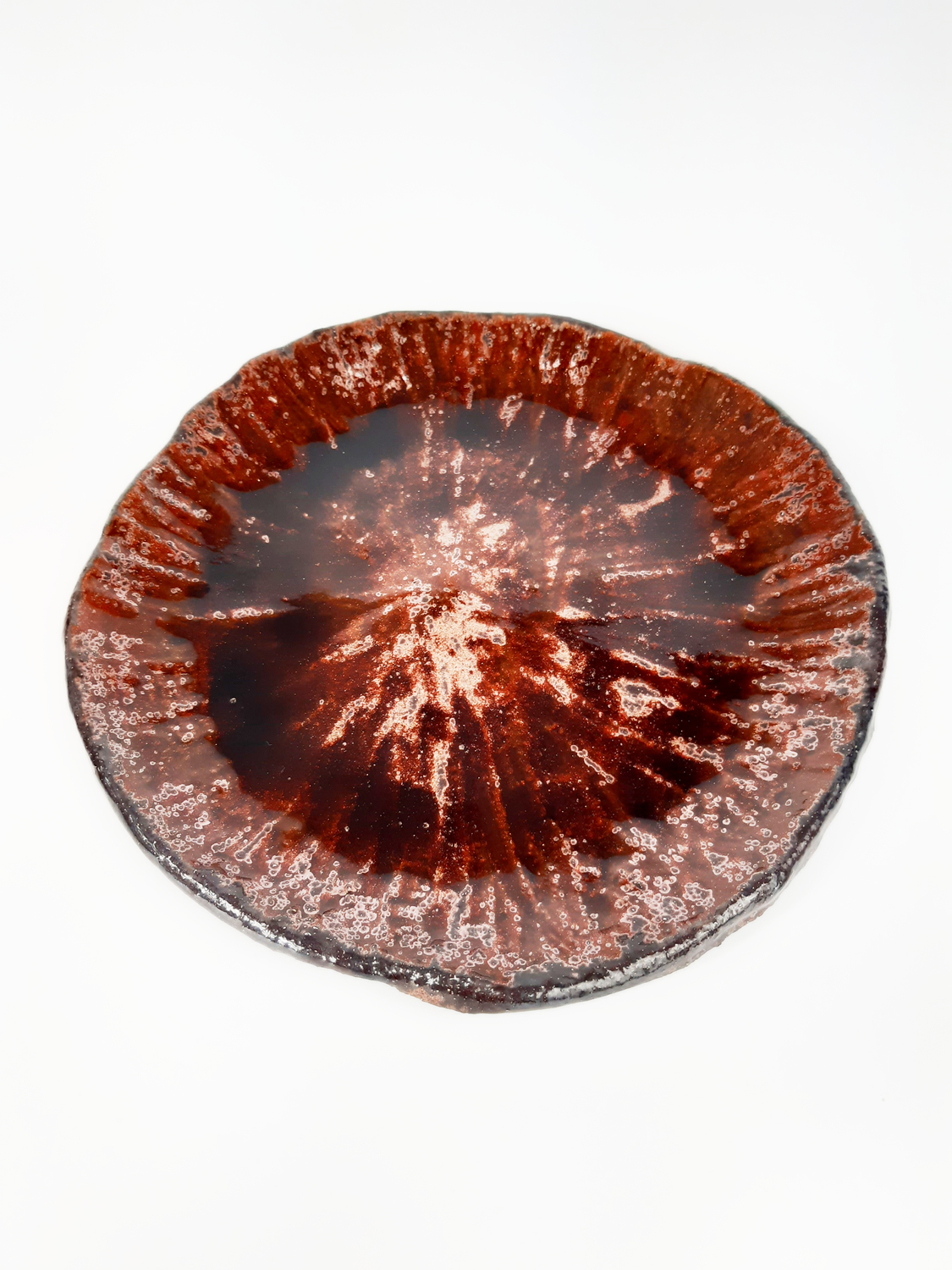 Masywny talerz wykonany "prymitywną" metodą wylepiania z czerwonej masy ceramicznej. Szkliwiony dwukrotnie i wypalony trzykrotnie dla uzyskania kilku warst widocznych w transparentnym szkliwie. Talerz mieni się w świetle dzięki drobinkom przypominającym brokat zanurzony w szkle. Szkliwa naniesione na naczynie w odcieniach brązu. Wejdź na https://www.instagram.com/p/CgURc8wlQ8g/ i przyjrzyj się lepiej temu i innym produktom.
