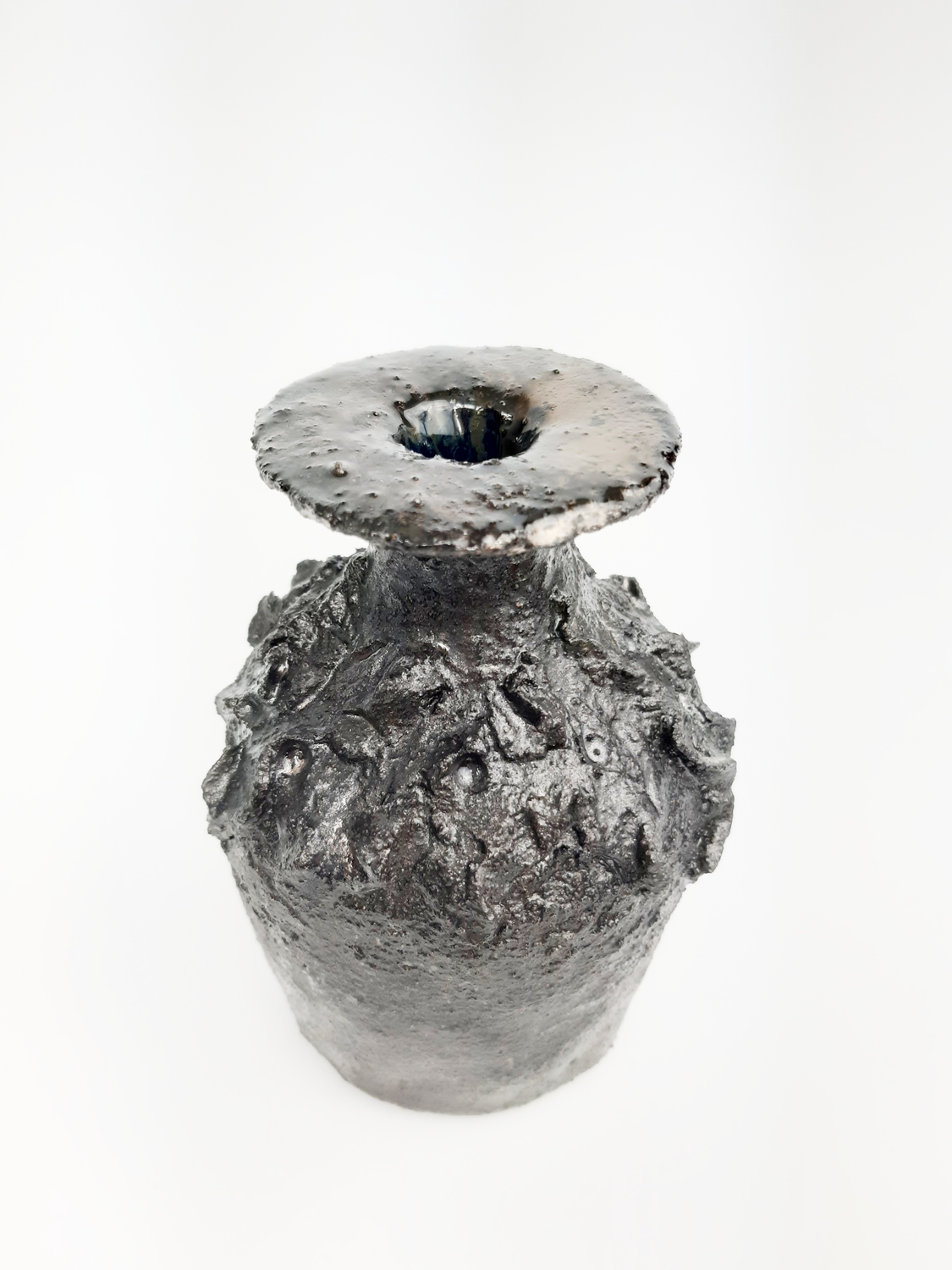Forma ceramiczna wylepiona ręcznie "prymitywną" metodą z czerwonej masy. Poszkliwione metalicznym szkliwem. Wyraźna faktura, porowata powierznia. Nieregularna forma przypominająca stop metali. Nie do użytku z żywnością. Zobacz jak wygląda w promieniach słońca, na krótkim filmie: