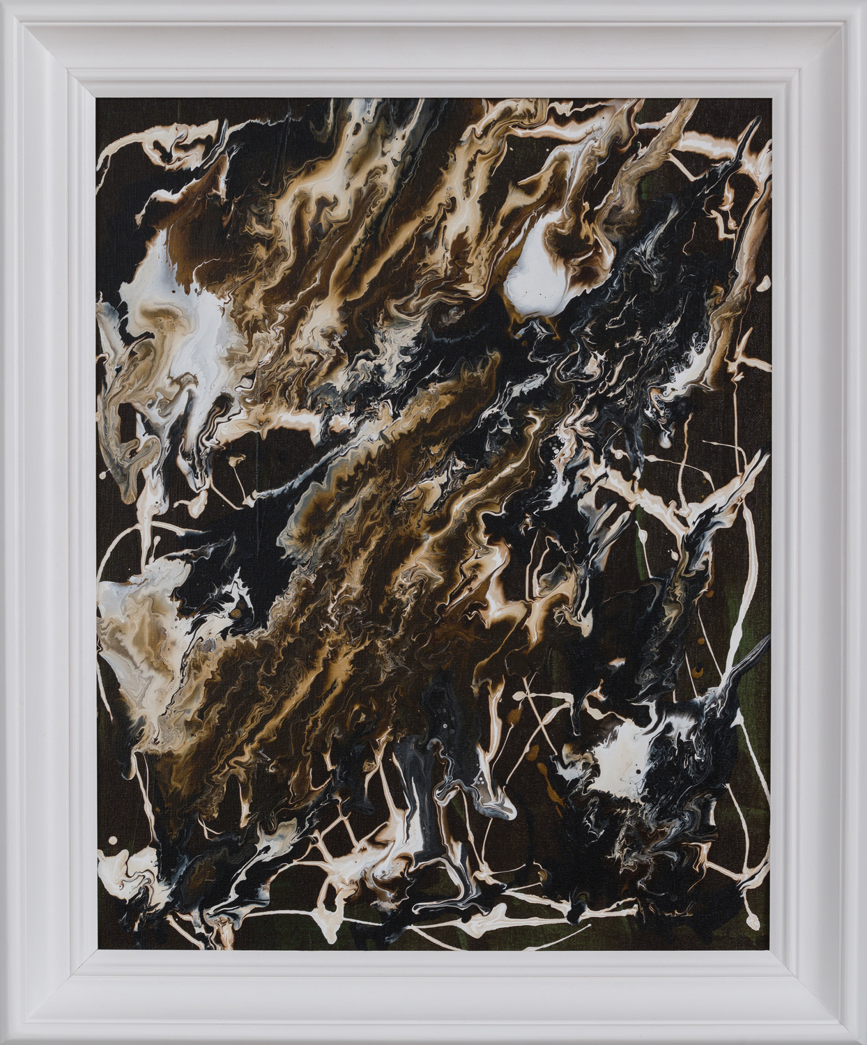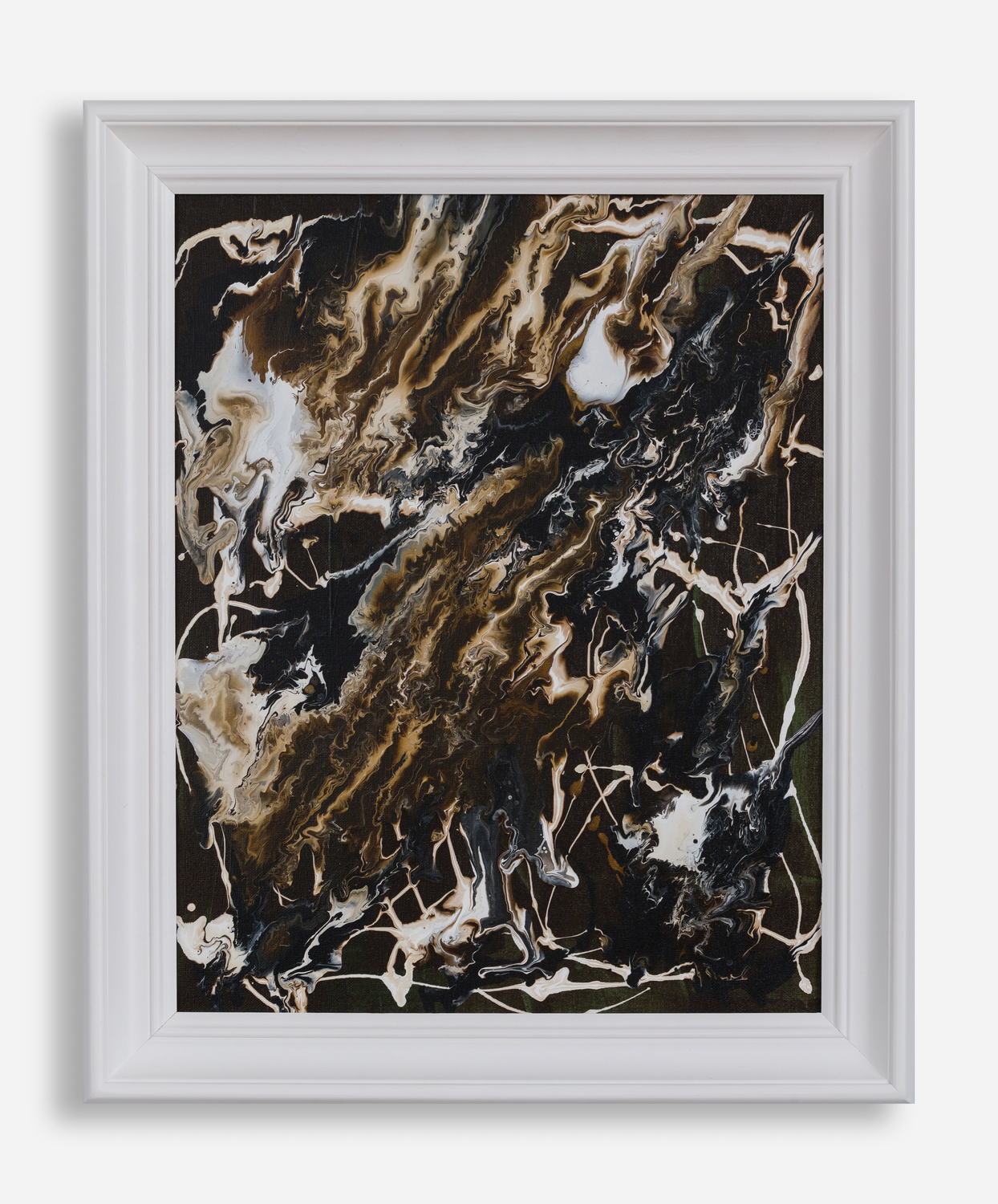 Obraz na bawełnianym płótnie, naciągniętym na krosno malarskie. Oprawiony w drewnianą ramę o szerokości 50 mm. Zabezpieczony werniksem. Ręcznie wykonany techniką mieszaną głównie jest to pouring, na bazie farb akrylowych. Dynamiczna abstrakcyjna kompozycja w barwach ziemi. Na rewersie podpis autora.