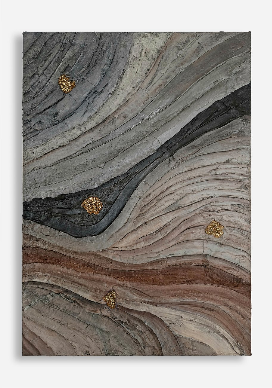 Prezentowany obraz to wyrafinowana kompozycja strukturalna, która emanuje surowym pięknem natury, przywołując skojarzenia ze skamieniałymi warstwami ziemi i geologicznymi zapisami czasu. Przenikające się linie i faktury przypominają przekrój skalnych formacji, w których każda warstwa opowiada historię ewolucji i przemian.